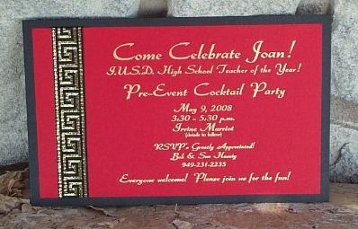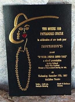 This is a Hot Foil Stamped Invitation In our hot stamping process we use foundry type or in this case Ludlow typesetting. The metal type is standing in relief and is then presses into the paper. In this example Admiral Script set on the Ludlow line caster was used. The gold is a mat gold which gives an elegant almost burnished look Ribbon and mounting was completed in our shop |