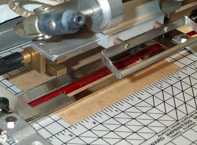 | We are showing the standard ribbon Guide installed on the baseplate. The photo on the LEFT is our machine with 3/8 ribbon installed and moving through the guide. See how the guide holds the ribbon form the bottom and the top. This is unique to this machine and very very helpful in keeping the ribbon straight while foil stamping and feeding through the machine. The photo on the Right shows the ribbon guide attached to the baseplate. BUT!!!! Take a look below and see how we do it in our shop. We have two of the ribbon guides attached to the base plate. This allows you to rewind the ribbon at the same time you are imprinting !! No more ribbon on the floor or needing to be rewound after you are done printing you job. |